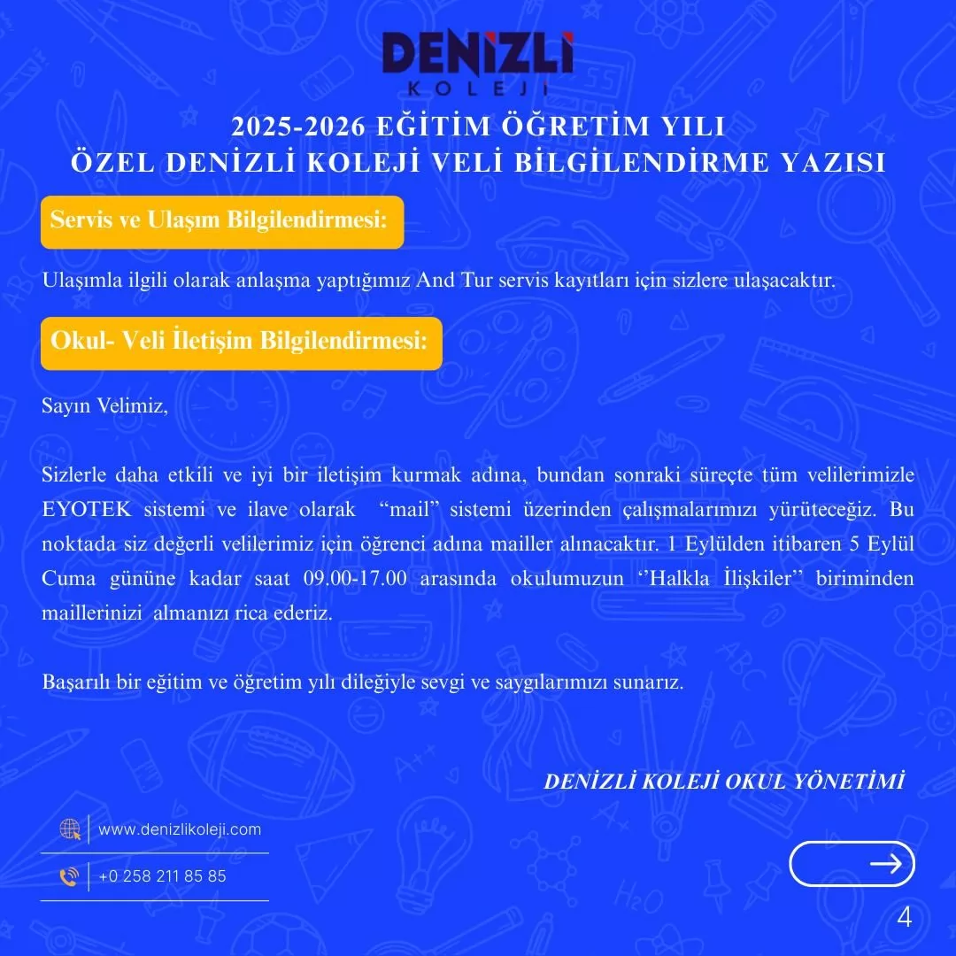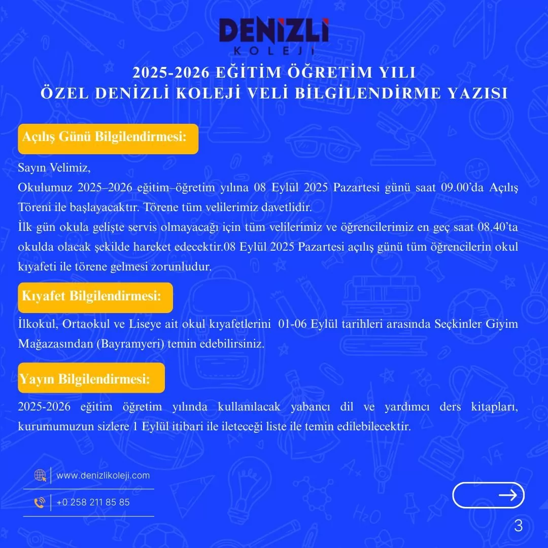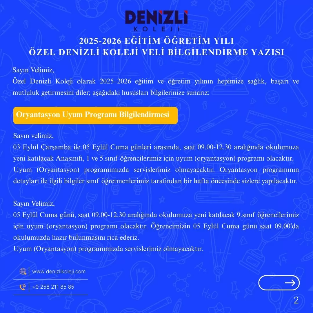 Değerli velilerimiz, 2025-2026 eğitim öğretim yılına ait; okul kıyafeti, kitap-kırtasiye ve uyum haftası gibi çeşitli bilgilerin yer aldığı ''Bilgilendirme Bültenimiz'' görsellerde mevcuttur. Görsellerin incelenmesini rica ederiz. 20.08.2025